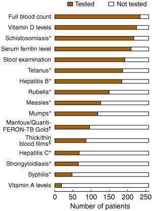 The most common laboratory tests performed were full blood examinations, vitamin D levels and schistosomiasis serology (Box 2). Vitamin D deficiency was the condition most frequently detected by laboratory investigations, followed by anaemia, iron deficiency, gastrointestinal parasite infection, and schistosomiasis (Box 3). There were variations in the prevalence of conditions between regions of birth. Compared with refugees born in eastern Africa, refugees from western Africa were unlikely to have vitamin D deficiency, while schistosomiasis and hepatitis B infection were more prevalent.