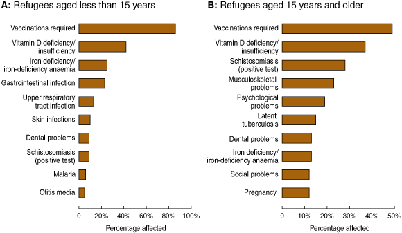 Results: Data were collected from 258 patient files. Most patients were from Sudan (57%) or Liberia (17%). Half were aged under 15 years. The most common health problems identified were inadequate vaccinations, nutritional deficiencies (vitamin D and iron), infectious diseases (gastrointestinal infections, schistosomiasis, and latent tuberculosis) and dental disease. Musculoskeletal, psychological and social problems were common in adults. 37% of patients were tested for latent tuberculosis, and 25% of these tested positive.