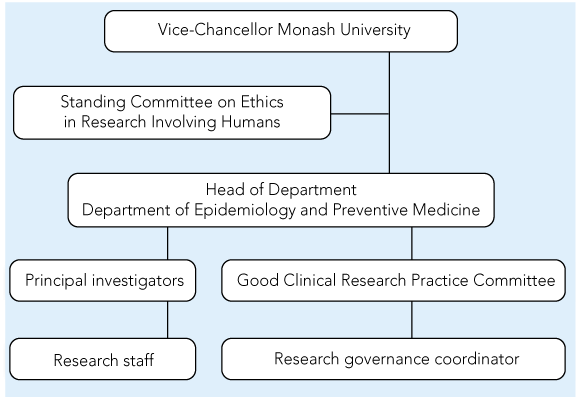 Institutional responsibility for research governance has been adopted by Monash University’s Department of Epidemiology and Preventive Medicine, providing clear lines of accountability for researchers as well as support and guidance.