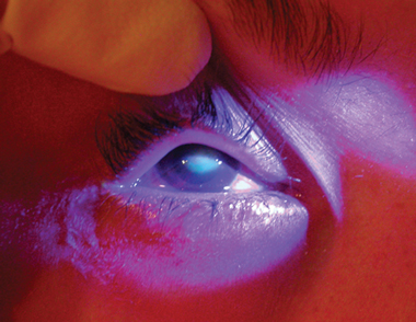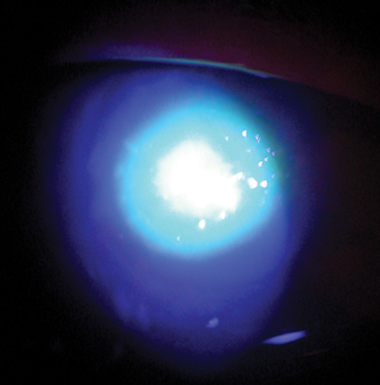 Fluorescein staining of a central corneal scar after Pseudomonas keratitis