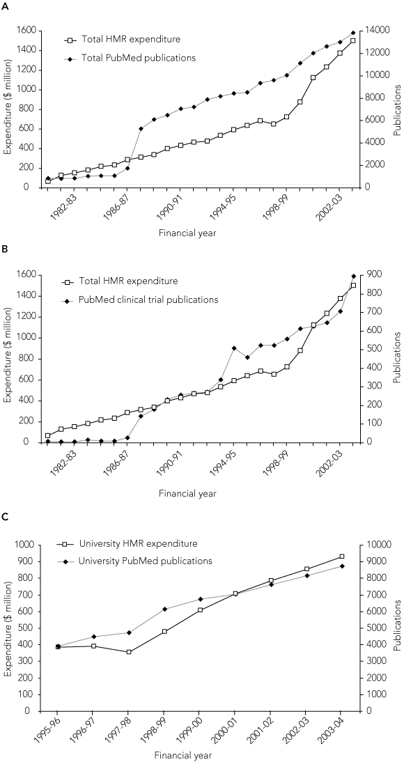 Building on this limited finding, we studied the association between expenditure on HMR in Australia and publications listed in PubMed between 1980 and 2004.