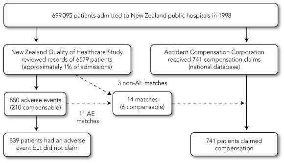 Participants and setting: Patients who experienced an adverse event associated with care in NZ public hospitals in 1998 and claimed compensation with the ACC, the national no-fault insurer (n = 741). Patients identified by the NZQHS as having sustained an adverse event associated with hospital care in the same year who did not file a compensation claim (n = 839).