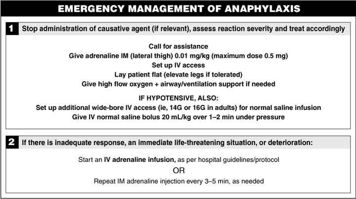 Despite their widespread clinical use, medications such as antihistamines and corticosteroids have no proven efficacy in preventing or treating anything other than mild cutaneous allergic symptoms. Furthermore, the cost of maintaining or using these medications in people with anaphylaxis due to other causes needs to be balanced against the cost of purchasing an additional EpiPen. Large doses of adrenaline may be required to treat hypotensive anaphylaxis,18 so Australians living in remote areas may need additional supplies beyond the single EpiPen unit subsidised by the current Pharmaceutical Benefits Scheme for individuals over 17 years of age. Even if an initial EpiPen injection has been effective, patients should seek emergency medical care without delay. Patients who live or work in remote areas should consider having access to means of summoning emergency assistance, such as a mobile telephone or, in some cases, an emergency satellite beacon.