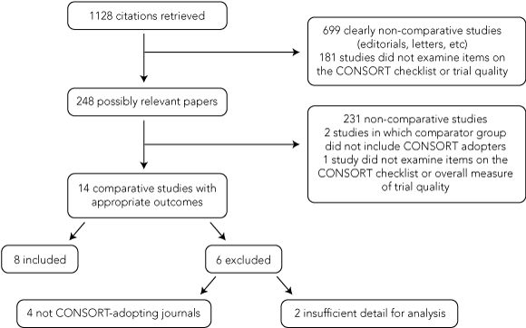 Studies were eligible if they were comparative studies evaluating the quality of RCT reporting; one of the comparator groups included RCTs reported in CONSORT-adopting journals; and outcomes reported included any of the 22 items on the CONSORT checklist, summary scores based on the CONSORT checklist, or any measures of overall trial quality.11 Study quality was not an exclusion criterion, and studies were not excluded based on publication status or language of publication.