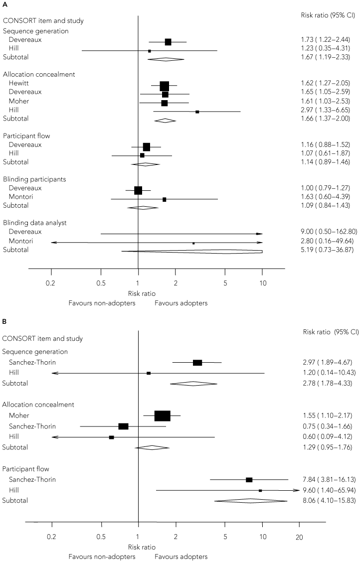 Data synthesis: 1128 studies were retrieved, of which 248 were considered possibly relevant. Eight studies were included in the review. CONSORT adopters had significantly better reporting of the method of sequence generation (risk ratio [RR], 1.67; 95% CI, 1.19–2.33), allocation concealment (RR, 1.66; 95% CI, 1.37–2.00) and overall number of CONSORT items than non-adopters (standardised mean difference, 0.83; 95% CI, 0.46–1.19). CONSORT adoption had less effect on reporting of participant flow (RR, 1.14; 95% CI, 0.89–1.46) and blinding of participants (RR, 1.09; 95% CI, 0.84–1.43) or data analysts (RR, 5.44; 95% CI, 0.73–36.87). In studies examining CONSORT-adopting journals before and after the publication of CONSORT, description of the method of sequence generation (RR, 2.78; 95% CI, 1.78–4.33), participant flow (RR, 8.06; 95% CI, 4.10–15.83), and total CONSORT items (standardised mean difference, 3.67 items; 95% CI, 2.09–5.25) were improved after adoption of CONSORT by the journal.