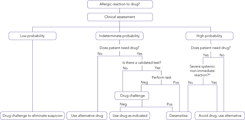 For type B (hypersensitivity) drug reactions, several options may be considered. After severe or life-threatening reactions, the drug should not be re-administered. For less severe reactions, a drug provocation challenge may be considered. For type B immunologically-mediated (allergic) reactions, the management option depends on the mechanism responsible for the reaction. If validated confirmatory tests are available, they should be used to determine the allergic status of the patient (eg, tests for penicillin-specific IgE antibodies). If such tests are not available — and in most cases they are not — several approaches can be taken. The simplest approach is to avoid the drug if an alternative agent is available. If an alternative drug does not exist, a graded challenge with the implicated agent can be done if the previous reaction was not life-threatening and not consistent with an IgE-mediated reaction. However, if the medication is needed as the drug of choice, then desensitisation should be considered.14
