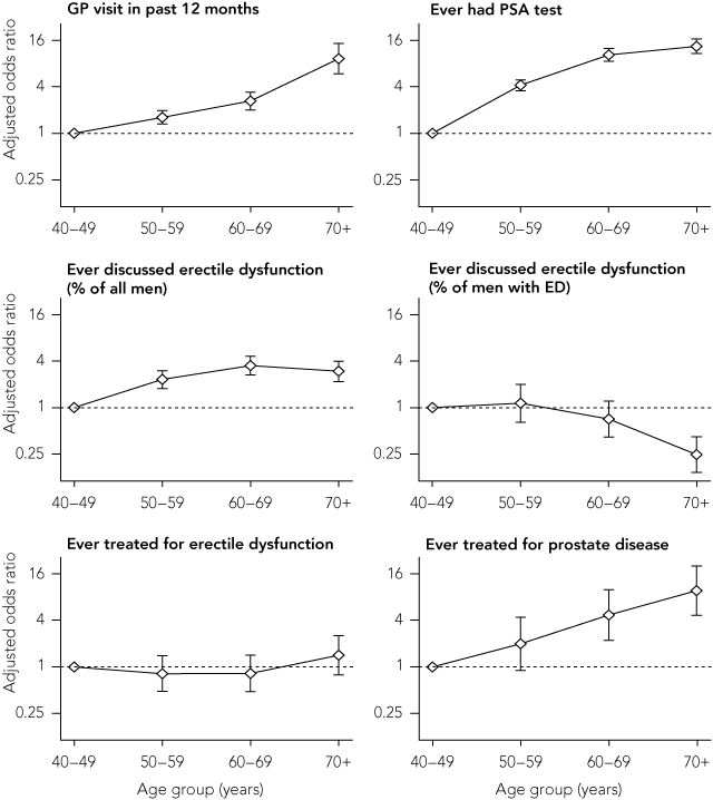 Results: Age was a significant predictor of all help-seeking behaviour studied, other than treatment for ED. Controlling for all predictor variables, never-married status predicted a lower likelihood of visiting a doctor (odds ratio [OR], 0.68 [95% CI, 0.48–0.97]) or speaking to a health professional about ED (OR, 0.44 [95% CI, 0.21–0.93]), while divorced/separated status predicted lower likelihood of having a prostate-specific antigen test (OR, 0.63 [95% CI, 0.50–0.79]). Living in a regional or remote area or being from a non-English-speaking background predicted lower likelihood of receiving treatment for ED (ORs, 0.62 [95% CI, 0.42–0.92] and 0.41 [95% CI, 0.24–0.72], respectively), but did not influence screening for prostate disease.