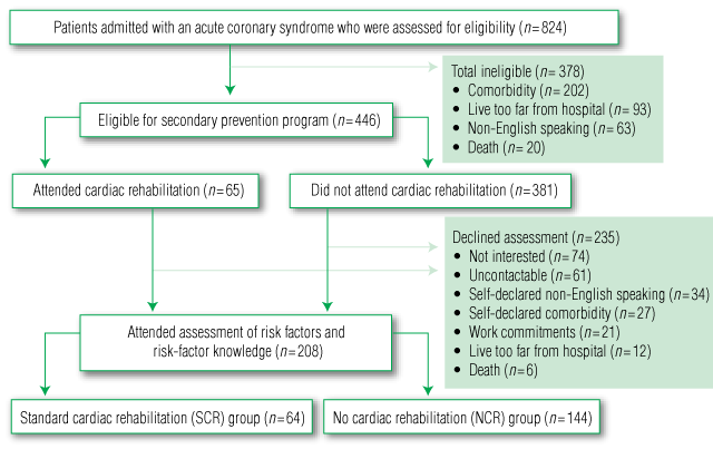 Conclusions: Patients not participating in cardiac rehabilitation after an ACS have more adverse risk profiles and poorer knowledge of risk factors compared with those about to commence cardiac rehabilitation. Alternate models for secondary prevention are required to improve health outcomes in patients not attending cardiac rehabilitation.