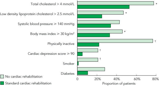 Results: Of the 446 patients eligible for cardiac rehabilitation, 208 attended for assessment (NCR: n = 144; SCR: n = 64). The NCR group had higher mean (± SEM) low-density lipoprotein (LDL) cholesterol levels (2.6 ± 0.1 v 2.3 ± 0.1; P = 0.02), and were more likely than the SCR group to have a total cholesterol level of > 4.0 mmol/L (78% v 53%; P < 0.001) and an LDL cholesterol level > 2.5 mmol/L (47% v 25%; P = 0.01). They were more likely than the SCR group to be physically inactive (77% v 22%; P < 0.001); obese (46% v 33%; P = 0.04); depressed (21% v 5%; P < 0.001); or current smokers (21% v 1%; P < 0.001). Compared with the SCR group, the NCR group also had higher risk scores (LIPID risk score) (4.5 v 2.1; P < 0.001); lower quality of life (Medical Outcome Short Form [SF-36] Health Survey); and significantly poorer knowledge of risk factors. Among patients with at least two modifiable cardiac risk factors, the NCR group were less likely than the SCR group to be able to state at least one risk factor (24% v 38%; P < 0.001).