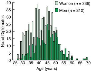 Diplomates constituted 15% of the calculated full-time-equivalent GPs in Victoria (Ms Luisa Abiuso, Senior Policy Officer, Workforce Policy Service and Workforce Planning, Department of Human Services, Victoria, personal communication). Diplomates comprised 52% women and 48% men. Compared with the overall sex distribution of Victorian GPs, Diploma training is more likely to attract women (odds ratio [OR], 2.0; 95% CI, 1.1–3.5).10 The age distribution of Diplomates was not uniform (z = 2.04; P < 0.000). Their median age was 42 years (Box 1), and Diplomates aged under 45 years were more likely to be female (OR, 4.2; 95% CI, 2.9–5.9).