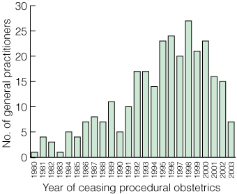 Sustainability of GP obstetrics workforce: Diplomates retired from practice with increasing frequency over the 1990s. During the years 1996 to 1998, the number retiring from obstetric practice exceeded the number of new Diplomates. The number retiring yearly fell from the year 2000 (Box 3). Doctors of all age groups retired from practice. Women doctors who completed the Diploma tended to retire from procedural practice earlier than men; 58% retired in less than 2 years, and 90% in less than 7 years.