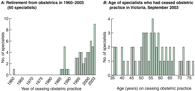 Our findings support the prediction that there will “soon be a shortage of experienced practising obstetricians in Australia”.2 Retiring specialists are mainly in older age groups, but specialists of all ages have ceased obstetric practice. Compared with an earlier study that found 8.6% of specialists had never practised obstetrics,12 we found that 33.3% of Victorian specialists had never practised obstetrics, an increase of 24%. There was a high proportion of women within the obstetric workforce, but AMWAC has described how career interruptions for family reasons have the potential to reduce female participation to 74% of that of male obstetricians.13 Thus, a pattern is emerging of increasing retirement from obstetric practice, falling intention to practise obstetrics, and a decrease in the overall obstetric work output because of family commitments.