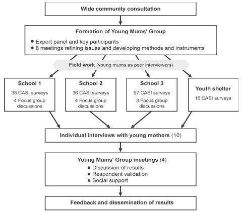We chose a mixed-methods study design with an inductive qualitative approach. Data collection involved a computer-assisted self-interview (CASI) and focus group interviews. The innovative consultative methods of the project are outlined in Box 1. Briefly, a Young Mums’ Group operating on a participatory action model17,18 served to design the project, and act as key participants and peer interviewers, and as a social support group.