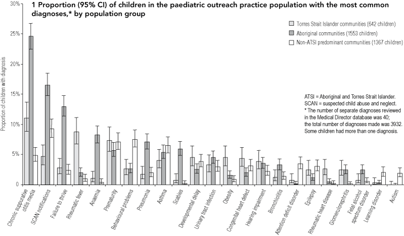 Results: 3562 children were referred during the study period, and a total of 3932 diagnoses were made; 56% of the paediatric population of the Aboriginal communities and 23% of the paediatric population of Torres Strait Islander communities were seen. Of 40 separate diseases/health problems reviewed, the three most common reasons for presentation were chronic suppurative otitis media, suspected child abuse and neglect, and failure to thrive. In the paediatric population of Aboriginal communities, the prevalence of fetal alcohol spectrum disorder was at least 15/1000 (1.5%), and in Torres Strait Islander children, rheumatic heart disease prevalence was at least 6/1000 (0.6%). Rheumatic fever rates were among the highest in Australia.