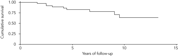 Of patients with RHD, 29/30 had mitral valve procedures (Box 3). One patient with RHD had a homograft aortic valve and was still alive at 94 months’ follow-up. At 5 years’ follow-up, all seven patients who had undergone valve repair or valvotomy alone were still alive.