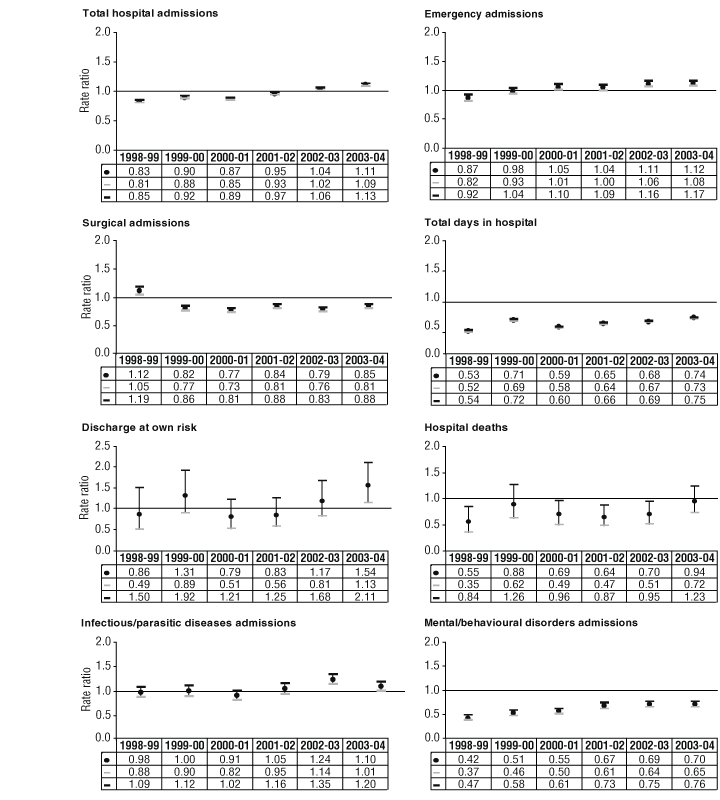 Main outcome measures: Age-standardised rates and rate ratios for: total hospital admissions; emergency admissions; surgical admissions; total days in hospital; discharge at own risk; hospital deaths; admissions due to infectious and parasitic diseases; and admissions due to mental and behavioural disorders.
