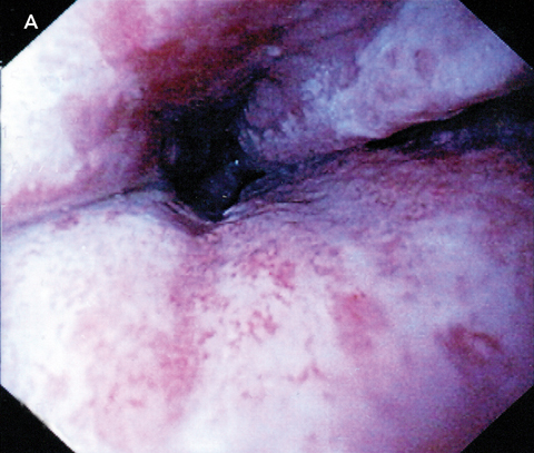 There was no other relevant medical history. The patient was a non-smoker and consumed only small amounts of alcohol. Results of a physical examination, electrocardiogram and chest x-ray were all normal. Upper gastrointestinal endoscopy revealed circumferential ulceration, with clearly visible submucosa of the distal 8 cm of the oesophagus (Box A). The stomach was normal. There was patchy erythema in the first part of the duodenum, but the second and third parts were normal. Histological examination of oesophageal biopsies demonstrated only granulation tissue. Duodenal biopsies were normal.
