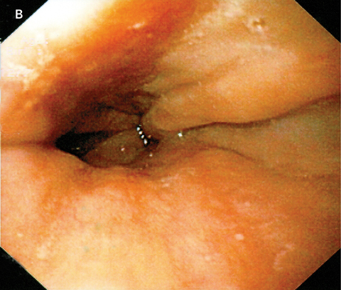 The patient was commenced on 40 mg daily of esomeprazole (a proton-pump inhibitor). Over the following week, he experienced a gradual improvement in his odynophagia and was able to return to a normal diet. Esomeprazole treatment was continued for 8 weeks and he remained asymptomatic. A repeat upper gastrointestinal endoscopy a further 2 weeks later showed complete healing of the oesophagus (Box B).