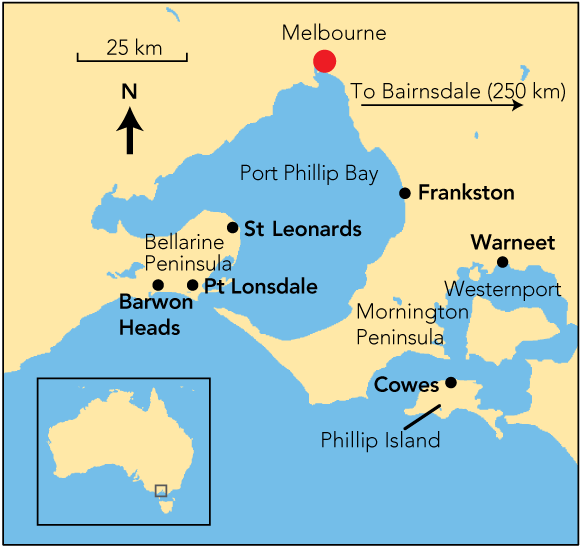 BU continues to occur in low numbers in the Bairnsdale/Gippsland Lakes area. In 1980, a new focus was noted near Tooradin and Warneet (Box 1) on Westernport,7 and this was followed by significant outbreaks at East Cowes on Phillip Island (1992–1995),7,11,12 Frankston and Langwarrin (1990–1998),7 St Leonards (1998–2001), Point Lonsdale (since 2002)13 and Barwon Heads and Ocean Grove (since 2005). There are also frequent single cases from other parts of the Mornington and Bellarine Peninsulas.