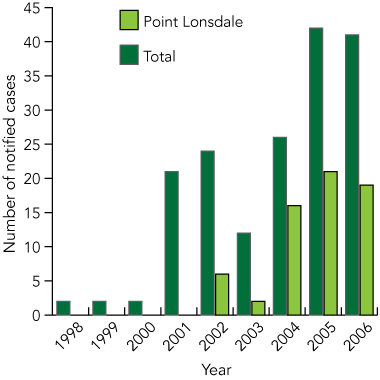 Notification was voluntary before 2004. Data for 2006 are only to August. Data are from the Victorian Department of Human Services and reference 7.