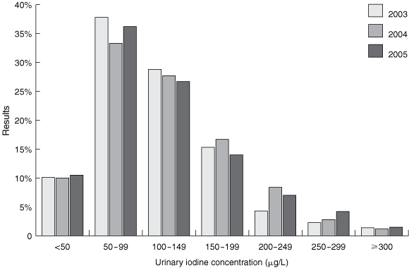 Cross-sectional urinary iodine surveys of schoolchildren were conducted in 2003, 2004 and 2005. Urinary iodine concentration was determined from spot urine samples using recommended methods.1