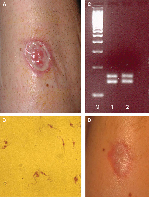 In conclusion, New World leishmaniasis is becoming more frequently reported among travellers, and the diagnosis must be considered in any traveller with a cutaneous ulcer who has come from an area of Leishmania endemicity. PCR speciation is necessary to optimise appropriate management of this potentially serious infection. Direct inoculation of tissue specimens into a Leishmania-specific culture medium may increase the yield of diagnostic material and thus enhance PCR sensitivity. Our case illustrates that amphotericin is an effective treatment for New World CL (although associated with reversible toxicity) and that an affected patient can be managed successfully as an outpatient under close supervision.