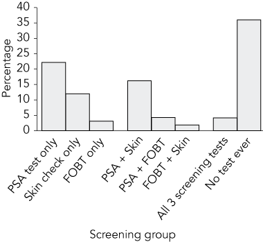 Almost 52% of men reported ever having at least one PSA test for any reason, compared with 15.5% who reported an FOBT and 45.4% who reported whole-body skin examination (Box 1). More than 80% reported that either their most recent PSA test or FOBT was done for screening purposes, compared with 57.8% of men reporting a skin examination done for screening.