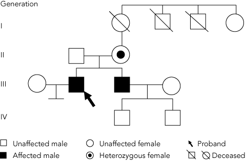 Establishment of the correct diagnosis in the patient led to the finding that his mother and brother were also affected, enabling them to be advised about precautions. The genetic implications for the family’s younger generation were not critical, as the proband had no children, and his brother’s children were both male and could not have inherited their father’s X chromosome (Figure).