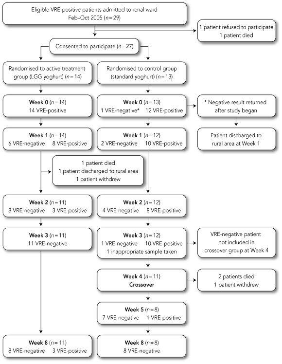 Results: Of the 27 patients enrolled, 23 completed the study. Two patients were lost to follow-up, one died and one withdrew. All 11 patients in the treatment group who completed the study cleared VRE. Three subjects reverted to VRE positivity after using antibiotics to which LGG is sensitive, while all others remained negative for at least 4 weeks after trial completion. Twelve control subjects completed the study, of whom one cleared VRE and 11 remained VRE-positive. Eight of these 11 patients were subsequently crossed over to receive LGG yoghurt, and all cleared VRE within 4 weeks.