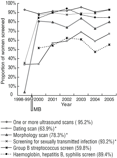 4 Antenatal screening of all women attending TAIHS, 2000–2005, showing the increased proportion of women in the MB group screened