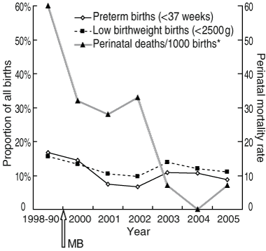 The proportion of preterm births in the MB group has remained lower than that for whole-of-population figures for Indigenous women in Queensland and is not dissimilar to figures for non-Indigenous women in Queensland2 and Australia.1