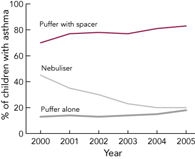 Our study period coincides with an important event in asthma management in Australia — the Asthma Management Program, which was announced in the 2001–02 federal budget, and emphasised evidence-based asthma management.1 Some of the volatility in the use of asthma medications and delivery devices may reflect improved awareness among doctors and patients of best practice. The decline in nebuliser use may indicate improved confidence among parents in the use of spacer devices, reflecting changes in emergency department and specialist practice, and instruction in these techniques by community asthma educators. The fall in the use of ipratropium bromide probably reflects the decline in nebuliser use, as this drug is sold in nebules as well as in a metered aerosol. Declines in the use of cromoglycate and nedocromil are part of an international trend, with heightened emphasis on the use of inhaled corticosteroids, and doubts about the effectiveness of sodium cromoglycate.11