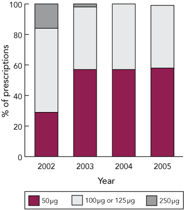 Medicare Australia data (Box 4) showed increases in the total number of prescriptions dispensed for fluticasone-containing products from 2002 to 2005, but a decrease in the number of defined daily doses per thousand 5-year-old children. Over the same period, numbers of prescriptions for salbutamol nebules and cromoglycate decreased. Medicare Australia data also showed a shift to less potent forms of fluticasone from 2003 (Box 5).