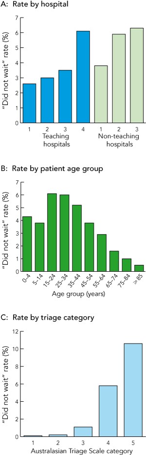 There is significant variability in DNW rates across hospitals and countries. Previously published rates for EDs in south-western Sydney are 4.9%,5 5.7%6 and 8.6%.3 International rates range from 0.8% to 8.2%,1,2,7-13 with an average of 4.0%. Higher DNW rates have been reported by major teaching hospitals6,13 and in public versus private hospitals.13 This raises concerns that patients with lesser means to find alternative health care are more likely not to wait.
