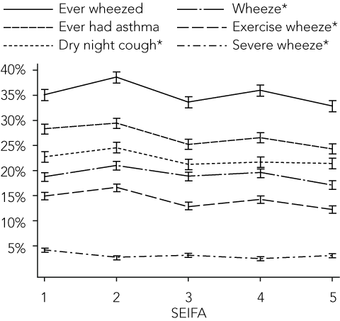 We were able to determine the ABS census collection district number for 7408 of the 7813 respondents (94.8%). There was some evidence that disadvantaged children were more likely to have exercise-induced wheeze (P = 0.06), and episodes of asthma severe enough to limit speech to a few words (P = 0.013) (Box 2). However, SEIFA-related trends were not evident for the remaining asthma symptoms (P > 0.05 for each).