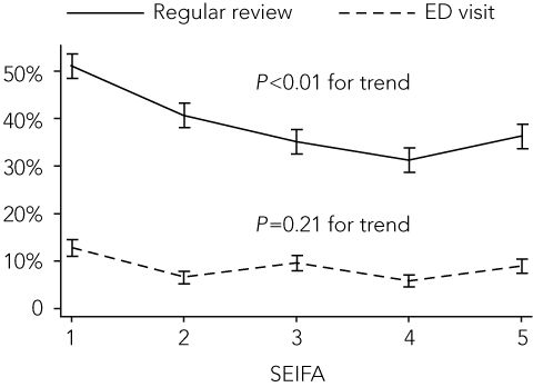 3 Proportion of the children with wheeze during the preceding 12 months (n = 1472) who had a regular asthma review by a GP, or attended an ED with a wheeze episode, by SEIFA quintile