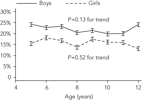 The proportion of children with parent-reported wheeze during the preceding 12 months was greater among boys than girls (mean difference, 4.2%; 95% CI, 1.9%–6.4%), and this relationship remained relatively constant throughout the primary school years (Box 6).