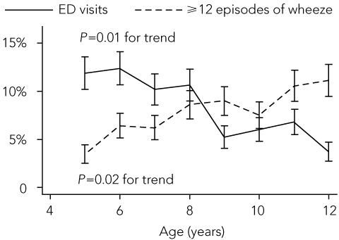 Among children with parent-reported wheeze during the preceding 12 months, there was an age-related increase in the proportion of children who had very frequent wheeze (≥ 12 episodes per year) (Box 7). However, by contrast, there was an age-related decrease in wheeze-related GP reviews (P < 0.001), emergency department visits (P = 0.02), and hospitalisation (P = 0.04).