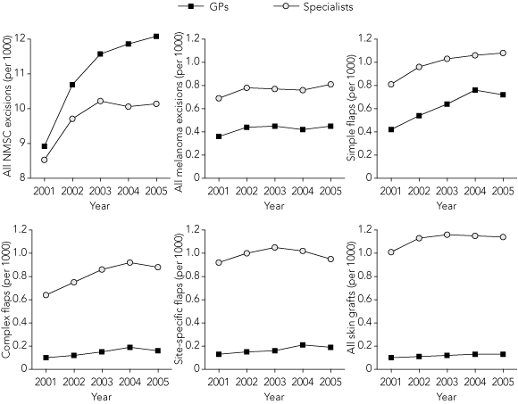 Results: NMSC excisions in Australia increased from 338 712 (2001) to 451 628 (2005), a mean annual increase of 1.11/1000 population (P = 0.04); GPs did 51.1% of excisions in 2001, increasing to 54.4% in 2005, representing a higher mean annual rate increase than in specialists (P = 0.003). Nationally, melanoma excisions increased from 20 414 (2001) to 25 580 (2005); GPs did 34.3% of excisions in 2001, increasing to 35.8% in 2005 — a similar mean annual rate increase to that in specialists (P = 0.25). Total flap repairs increased from 58 550 (2001) to 80 742 (2005); GPs did 21.3% of flap repairs in 2001, increasing to 26.9% in 2005 — a similar mean annual rate increase to that in specialists (P = 0.83). Nationally, the excision to flap ratio for GPs fell from 14 : 1 (2001) to 12 : 1 (2005); in Queensland the ratio fell from 14 : 1 to 9 : 1 over the same period.