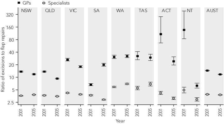 Nationally, the number of excisions per flap repair done by specialists was relatively stable, at about 3.8–3.9. In contrast, the excision to flap ratio for GPs fell from 14.1 in 2001 to 12.1 in 2005 (P < 0.001) (Box 3). In 2001, GPs in Queensland and NSW (the states with the highest level of skin cancer surgery activity) both excised 14.1 skin cancers per flap repair. In 2005, NSW GPs excised 12.1 skin cancers per flap repair, while their Queensland colleagues excised 9.2 skin cancers per flap repair (P < 0.001) (Box 3).