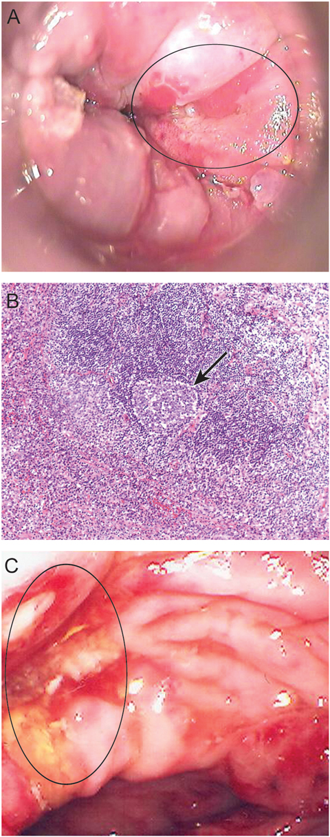 A 43-year-old man with previous Kaposi’s sarcoma presented with a 2-month history of per-rectal bleeding and diarrhoea. Colonoscopy, performed by a surgeon, showed multiple rectal ulcers suggestive of Crohn’s disease (Figure C), but biopsies showed non-specific acute and chronic inflammatory infiltrates only.