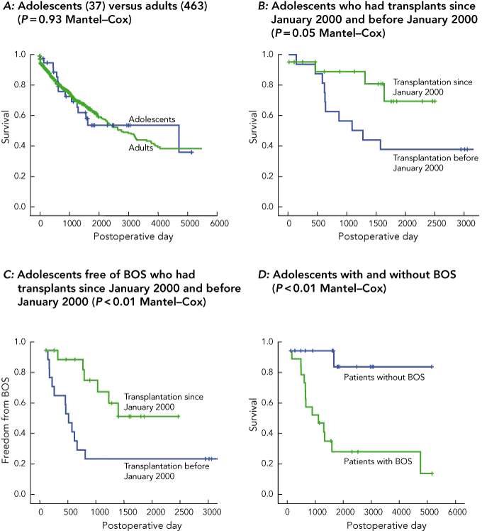 Main outcome measures: Overall survival compared with an adult cohort; survival free of bronchiolitis obliterans syndrome (BOS); overall and BOS-free survival in those transplanted before and after January 2000.