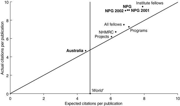 In contrast to the perplexing outcomes of our analysis of project grants, the results for program grants were in line with our expectations. Previous studies of NHMRC-supported research2,8 have shown that the block-funded institutes, and research fellows located in these institutes, have a citation impact well above that of other NHMRC funding schemes and other Australian research sectors. Thus, given the standing of researchers targeted by the program grants scheme and the substantial weight given to publications in the assessment criteria, we anticipated that successful applicants would have a very strong citation record. Our results confirmed this.