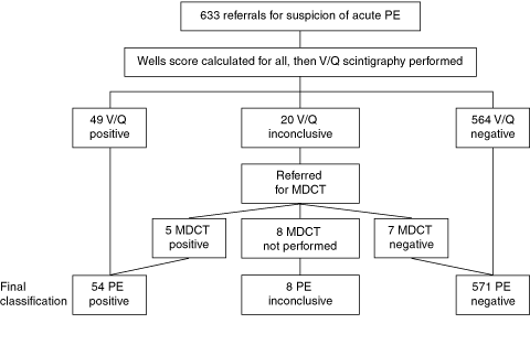 Design, setting and participants: Prospective, consecutive series of 633 studies on 595 patients referred to a major teaching hospital for ventilation/perfusion (V/Q) scanning for suspected acute PE between September 2004 and November 2005. Ventilation scintigraphy was performed using technetium-99m Technegas, and V/Q results were interpreted in conjunction with Wells scores.