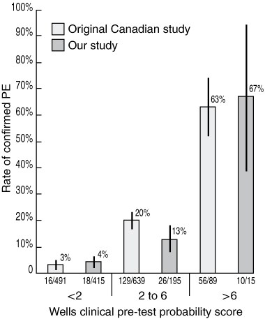 Results: The likelihood of PE for a given Wells score in our study was not significantly different from the likelihood in the original study by Wells et al. Scores of < 2 in our study were associated with a 4% risk of PE, scores between 2 and 6 with a 13% risk, and scores > 6 with a 67% risk. The overall prevalence of PE in our study was significantly less than that in the original study (9% v 16%; P < 0.01), attributable to a significantly larger proportion of our patients having scores of < 2 (66% v 40%; P < 0.0001).