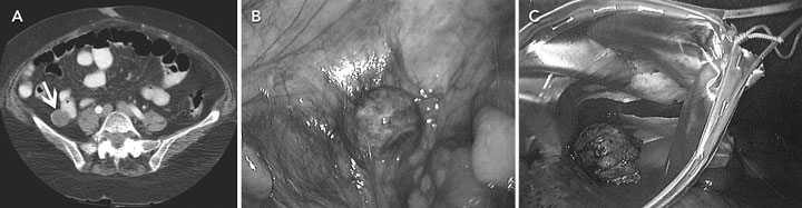 Laboratory investigations showed a serum lipase concentration of 393 U/L (reference range, 114–286 U/L) with normal white blood cell count. Abdominal computed tomography revealed a 2.8 × 2.4 cm mass in the right lower quadrant, with a calcific rim and foci of calcium within the lesion (Figure, A). The mass appeared to be outside the small bowel, suggesting a mucocele or mucoid tumour. Laparoscopy revealed a 2.5 cm solid mass containing a gallstone (Figure, B and C). The drainage from the umbilicus continued after surgery and was apparently unrelated to the spilled gallstone.