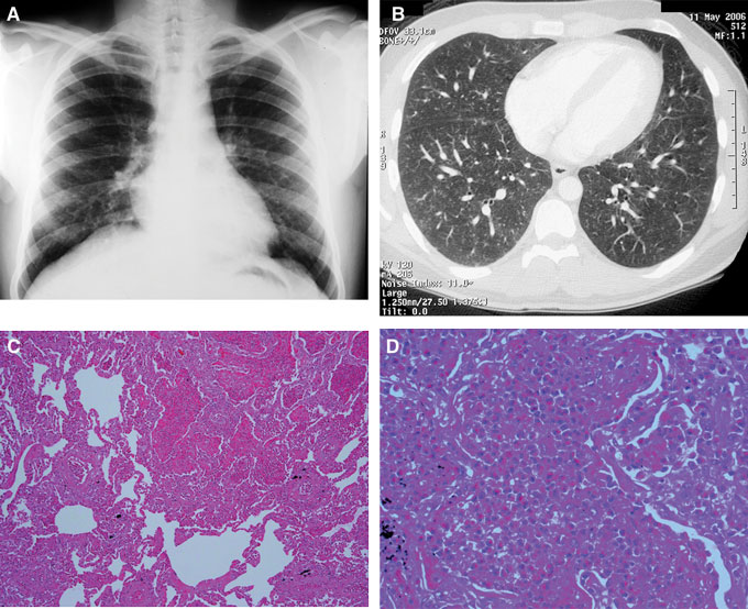 A 27-year-old man presented to an infectious diseases outpatient clinic in May 2006 with a 3-month history of nocturnal dry cough, paroxysmal dyspnoea, malaise and unintentional weight loss of 5 kg. He had previously presented to a general practitioner and was treated with two courses of antibacterial drugs without a decrease in symptoms. He had no significant past history of chronic respiratory illness or tuberculosis, was a non-smoker and had been working in Australia for 5 years. He was born in India and had recently returned there on a holiday to visit family and friends. Physical examination, including respiratory system examination, was unremarkable. Full blood examination revealed marked eosinophilia (28.8 × 109/L; reference range [RR], 0.0–0.5 × 109/L). A chest x-ray and computed tomography (CT) showed a diffuse, bilateral fine micronodular pattern throughout both lung fields (Figures A and B).