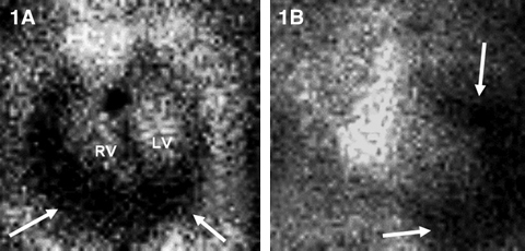 1: GHPS left anterior oblique 45° (1A) and anterior (1B) views. Pericardial halo suggestive of pericardial effusion (arrows). |