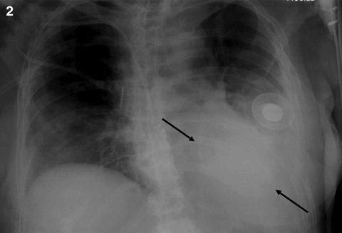 2: Anteriorposterior chest x-ray showing the saline-filled breast implant as a radio-opaque shadow on the left anterior chest wall (arrows). |