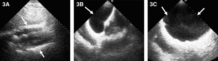 3: Two-dimensional echocardiogram. 3A: Subcostal views showing pericardial border anteriorly and posteriorly (arrows) without evidence of pericardial effusion. 3B: Subcostal view with the transducer directed anteriorly to image the saline-filled breast implant (arrow). 3C: Anterior chest wall imaging depicting the implant (arrows). |